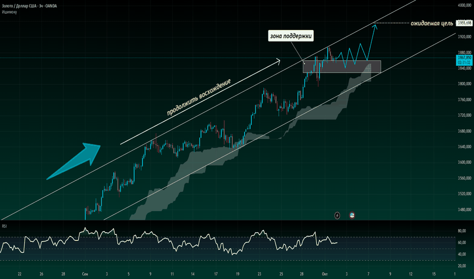На графике пара XAUUSD (золото) на бирже OANDA уверенно движется в восходящем канале, скапливаясь вблизи зоны поддержки $3860. Пока эта зона удерживается, восходящий тренд может в краткосрочной перспективе направиться к цели $3950–3955.