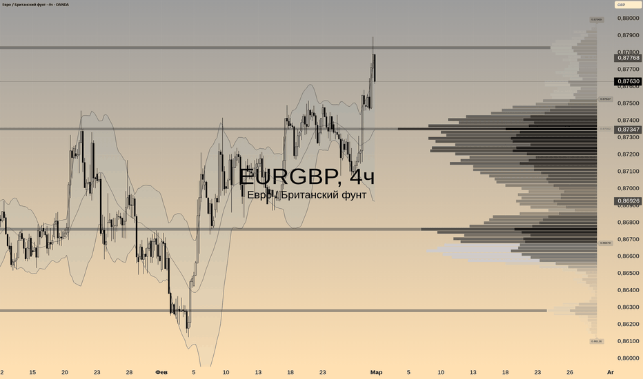 На 4ч пробита ключевая зона 0.873-0.874 и цена ушла выше максимальных объёмов по профилю справа. Свечи импульсные, котировка прижата к верхней полосе Боллинджера, RSI в зоне перекупленности, но без явной медвежьей дивергенции - тренд пока дышит полной грудью. Я вижу идею в лонг по тренду, но не с текущих хай, а после отката к пробитой области.