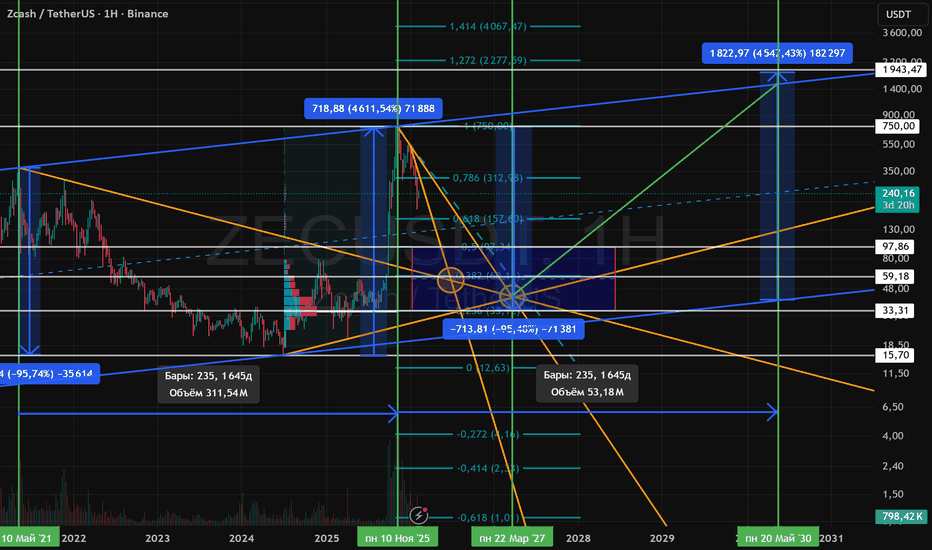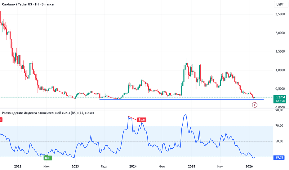 Cardano уже прошла несколько фаз глубокого спада (−90%+), каждая из которых сопровождалась длительными периодами консолидации и частичным восстановлением. Текущая структура показывает, что ADA торгуется вблизи нижней границы долгосрочного нисходящего канала, где давление вниз замедляется, но разворот тренда еще не подтвержден.