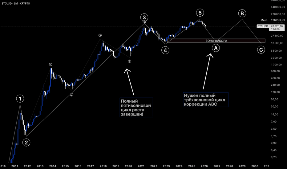 Если рассматривать BTC на всём историческом диапазоне, текущая структура выглядит очень интересно.