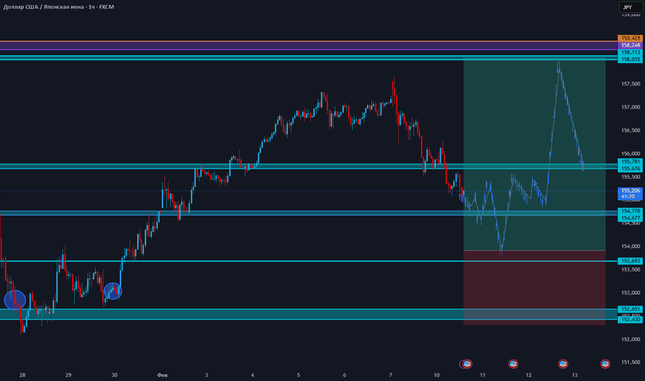 Итак, рассмотрим сценарий по валютной паре USDJPY, японская иена. На данный момент цена актива показывает локальное коррекционное нисходящее движение от области сопротивления 158.035-158.113. Ранее мы уже рассматривали шорт от границы данного диапазона, но цена немного не дошла до точки входа, и движение уже частично отработало без нас. Сейчас продажи рассматривать неактуально, так как потенциал снижения стал ограниченным. Цена торгуется в диапазоне между областью поддержки 154.770-154.687 и сопротивлением 155.676-155.781. С высокой вероятностью через фазу накопления произойдет импульсное движение вниз с ложным пробоем поддержки и ретестом следующего уровня 153.693, после чего актив может сформировать спекулятивный восходящий отскок. Потенциал роста при текущей формации сохраняется вплоть до возврата к области сопротивления 158.035-158.113. С учетом данной информации рассматриваем точку входа в лонг от границы уровня поддержки 153.693. Выставляем лимитный ордер.