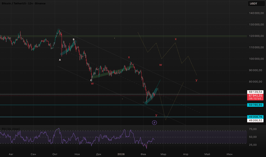 Bitcoin: Глобальный сценарий. Двойной зигзаг в процессе?На текущий момент основной гипотезой выступает формирование сложной коррекционной структуры - двойного зигзага (W-X-Y).