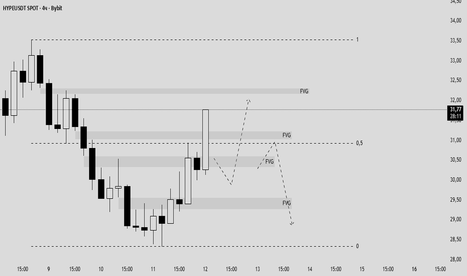 HYPE 4H: откат затухает под 0.5 — FVG сверху как sell-зонаНа 4H HYPE после восстановления из лоя не смог удержать импульс: цена снова съехала под 0.5 и начала формировать понижение в правой части графика. Сверху остаётся кластер FVG: ближайшие зоны в районе ~30.5–31.1 и выше — более дальний FVG около ~32.2. Под ценой отмечен нижний FVG в районе ~29.4–29.6, который выглядит как ближайшая цель, если sell-side продолжит давить. По текущей разметке логика такая: рынок может сделать ещё один откат в ближайший FVG над 0.5 (как ребаланс/зона предложения), после чего вероятен разворот вниз с возвратом к нижнему FVG и тестом discount. Пока цена не закрепится выше 0.5 и не начнёт удерживаться над ближайшими FVG, приоритет — продолжение снижения после коррекционного подъёма. DYOR