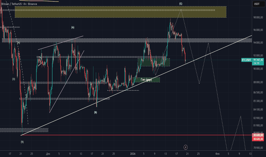 В случае уверенного пробоя и закрепления ниже восходящего канала, текущая структура будет нарушена. В таком варианте возможно развитие дальнейшего нисходящего движения с целями в районе 87 000 – 86 000.