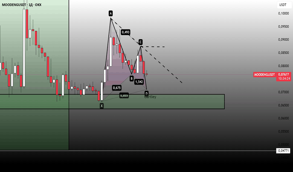 На данный момент актив находится в зоне поддержки 4H, а также пришёл в зону FVG недели и дня, откуда может последовать реакция, поскольку оптимальное движение было перекрыто по Фибоначчи. На дневном таймфрейме присутствует длинный паттерн Deep Crab и долговая модель «Turtle Soup». После пробоя уровня 0,323 был сформирован choch, что сигнализирует о смене тренда.