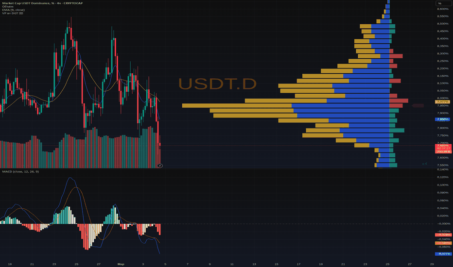 На 4ч графике USDT.D мы видим вертикальный слив доминации на повышенных объёмах, свечи пробили вниз жирный объёмный уровень района 8, где на профиле был основной "мешок" сделок. RSI в перепроданности, MACD только разгоняет медвежий импульс - пока ни намёка на разворот, рынок жмёт газ в сторону риска.