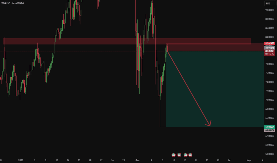XAG: откат в mid-range FVG, затем разворот и вынос ниже лоевНа D1 по серебру после резкого импульсного слива цена закрепилась в середине диапазона и сейчас торгуется вокруг нижней части зоны 0.5. Сверху выделены крупные области FVG (mid/premium), которые остаются магнитом для отката и снятия ликвидности на хаях диапазона. При этом сценарий на разметке предполагает сначала небольшой заход вниз (добор ликвидности), затем импульс вверх в верхние FVG с реакцией/отказом от зоны. После митигирования дисбаланса сверху ожидается разворот и продолжение снижения в сторону области 0 — как минимум до нижних целей под локальными минимумами. Ключевой триггер — поведение в верхнем FVG: принятие выше сломает идею разворотного отката, слабая реакция и возврат под 0.5 оставят приоритет за продажами после снятия ликвидности сверху. DYOR