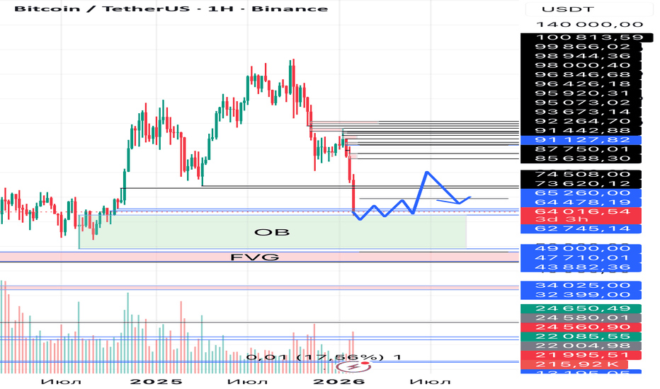 Биткоин, прогноз на февраль 2026 года! 🧐Прогнозирование краткосрочного движения - задача с повышенной сложностью и высокой погрешностью. Цена часто идёт иначе, чем ожидается. Но давайте все-таки попробуем смоделировать сценарий падения на февраль.