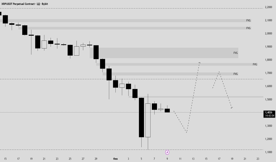 XRP: база после слива — добор под лои и доставка в цепочку FVG сНа D1 по XRP сохраняется чистый медвежий поток с сильным импульсным расширением вниз и последующей стабилизацией в районе 1.40. Внизу остаётся очевидная ликвидность под локальными минимумами — по сценарию допускается ещё один прокол для добора. Выше цены размечены несколько FVG: ближайшие в районе 1.55–1.60 и дальше — более высокие дисбалансы вплоть до зон около 1.70–1.90 и выше. Логика разметки проста: сначала снять остаточную ликвидность снизу, затем дать откат вверх на митигирование ближайшего FVG с протягиванием к следующим зонам. После снятия ликвидности сверху и реакции в верхних FVG ожидается откат обратно — там будет понятно, это ребаланс в рамках медвежьего контекста или рынок начинает принимать цену выше. DYOR