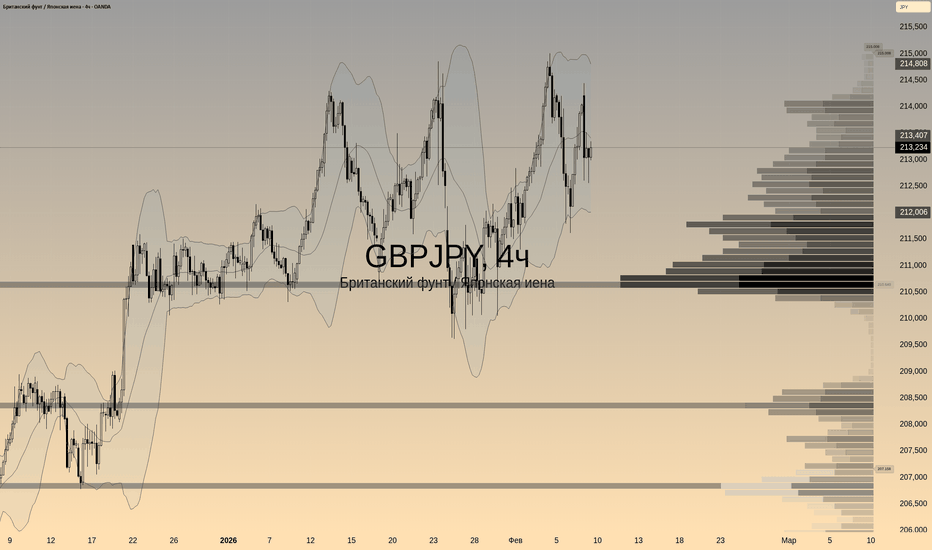 На 4-часовом графике после обновления хая в районе 215 получили длинный хвост вверх и откат обратно внутрь полос Боллинджера. Цена болтается над мощным узлом горизонтального объема 210.5-211, а RSI сверху уже развернулся вниз. Возможно, я ошибаюсь, но текущий поджим выше 213 больше похож на вынос стопов, чем на честный новый импульс вверх.