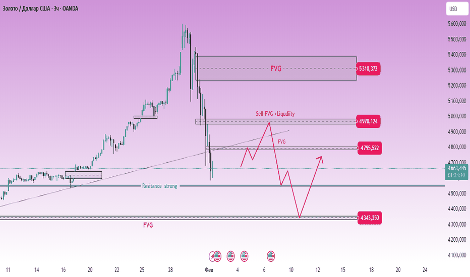 Пока цена остается ограниченной ниже зоны 4970–5000, любой отскок следует рассматривать как коррекционный. Ожидается дальнейшее продолжение движения вниз к более низкой ликвидности.