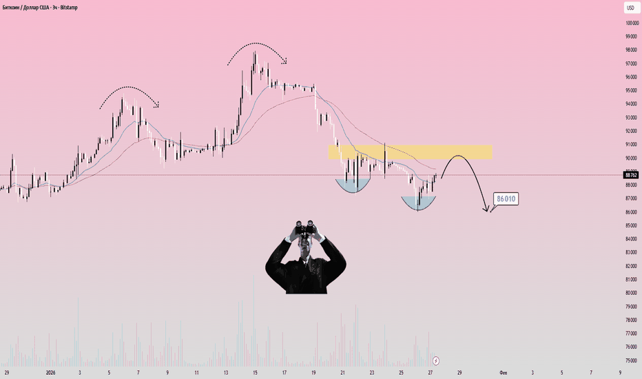 По биткоину глобально тренд всё ещё нисходящий. Структура роста формируется пока только на младших таймфреймах — старшие по-прежнему под давлением. Ключевая зона сопротивления в районе $90 000–91 000 остаётся не обновлённой и не пробитой — рынок её уважает.