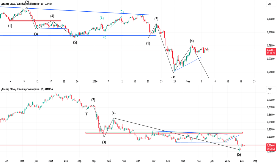 USDCHF: Сложная коррекция перед продолжением нисходящего импульсЧередование импульсных движений в обе стороны после завершения коррекции A-B-C указывает на формирование сложной и, вероятно, растянутой коррекционной структуры на старте нового нисходящего импульса. Такая динамика характерна для волн (2) или (4) в рамках зарождающейся движущей волны вниз, где рынок активно перераспределяет позиции перед решающим движением. Критическим уровнем, подтверждающим силу продавцов, остается начало бывшей волны А — теперь ключевое сопротивление.
