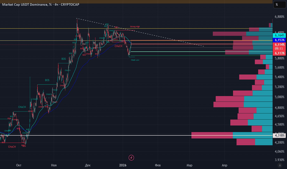 ➡️ Цель для снижения: В случае разворота, первой и главной целью для падения доминации станет зона Point of Control (POC), отмеченная на профиле объема, в районе 4.3% - 4.5%. Падение доминации к этому уровню будет означать массовый приток капитала в альткоины.
