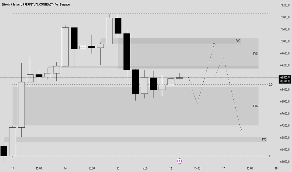 BTC 4H: удержание у 0.5 и попытка ребаланса — но при отказе рискНа 4H BTC после резкого слива из premium перешёл в фазу консолидации вокруг 0.5 (сейчас цена прямо на середине диапазона). Сверху виден кластер 4H FVG в premium (примерно ~69.2–69.6 и выше ~69.6–70.0): логичная цель для ребаланса/снятия ликвидности, где может появиться реакция и набор short’ов, если возврат будет слабым и без принятия выше.