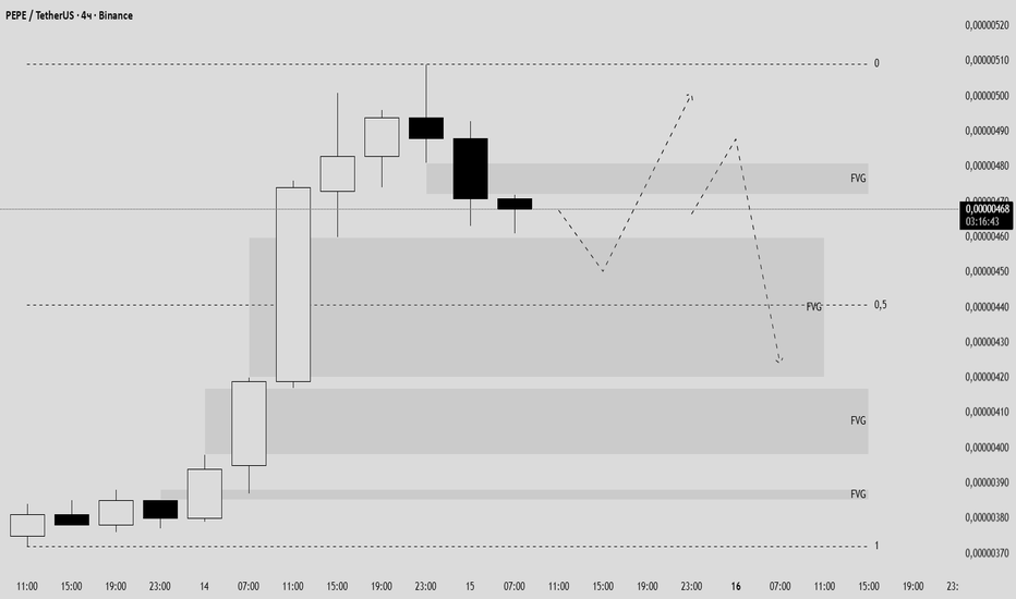 PEPE 4H: откат/ребаланс в верхний FVG — затем риск возврата в диНа 4H PEPE был импульсный рост, после которого цена упёрлась в премиум и начала “пилить” вершину. Сейчас рынок стоит прямо под/в районе верхнего FVG ~0.00000475–0.00000484 — логичная зона для ребаланса и реакции продавца. Базовый сценарий по разметке: добор ликвидности/касание верхнего FVG → отказ (rejection) → откат вниз к 0.5 (~0.00000440) и в средний дисконтный FVG ~0.00000420–0.00000460 (как основной “магнит” при коррекции). Если давление сохранится, следующие цели по неэффективности ниже — FVG ~0.00000400–0.00000412, а затем ещё глубже ~0.00000386–0.00000390. Пока цена не начнёт уверенно принимать выше ~0.00000484 (с закреплением), лонги здесь выглядят как вход в премиуме, а приоритет — ждать реакцию от FVG и подтверждение. DYOR.