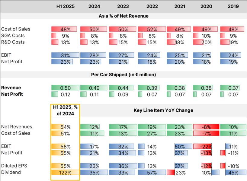While not quite as dramatic as in previous FYs – which have witnessed significant revenue growth Year-on-Year (YoY) after an 8% drop in pandemic-era FY 2020 – this comes with a key improvement in two metrics: the revenue accrued per car shipped has seen a 31% increase from around €380,000 in FY 2021 to a little over €500,000 as of H1 2025. Net Profit as calculated on a “per car shipped” basis has been even more dramatic in the same period: a 72% improvement to nearly € 120,000 as of H1 2025.