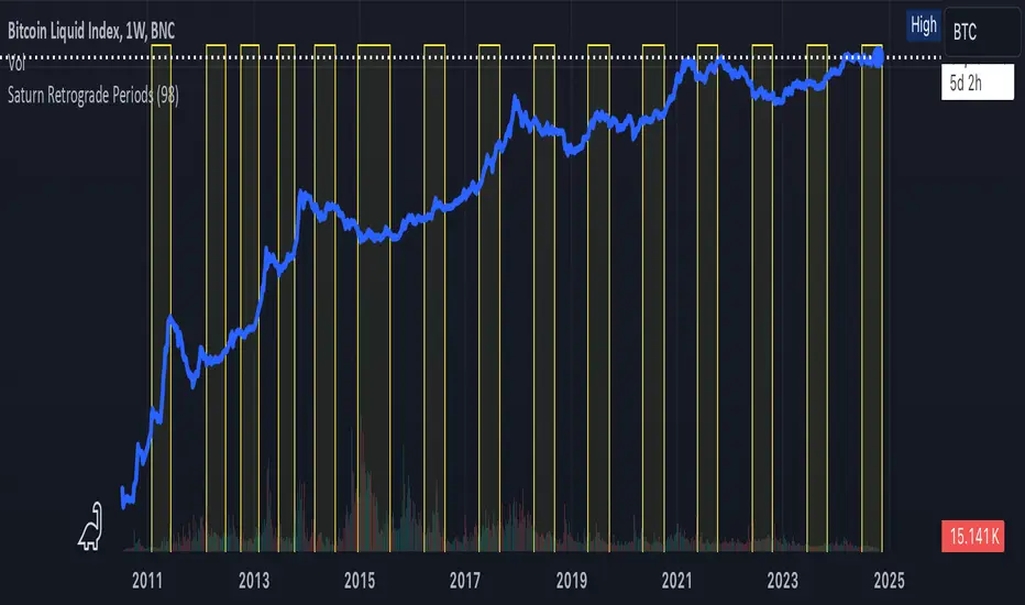 This Pine Script visualizes all Saturn retrograde periods since 2009, including the current retrograde ending on November 15, 2024. The script overlays yellow boxes on your TradingView chart to highlight the exact periods of Saturn retrograde. It's a great tool for astrologically-inclined traders or those interested in market timing based on astrological events.