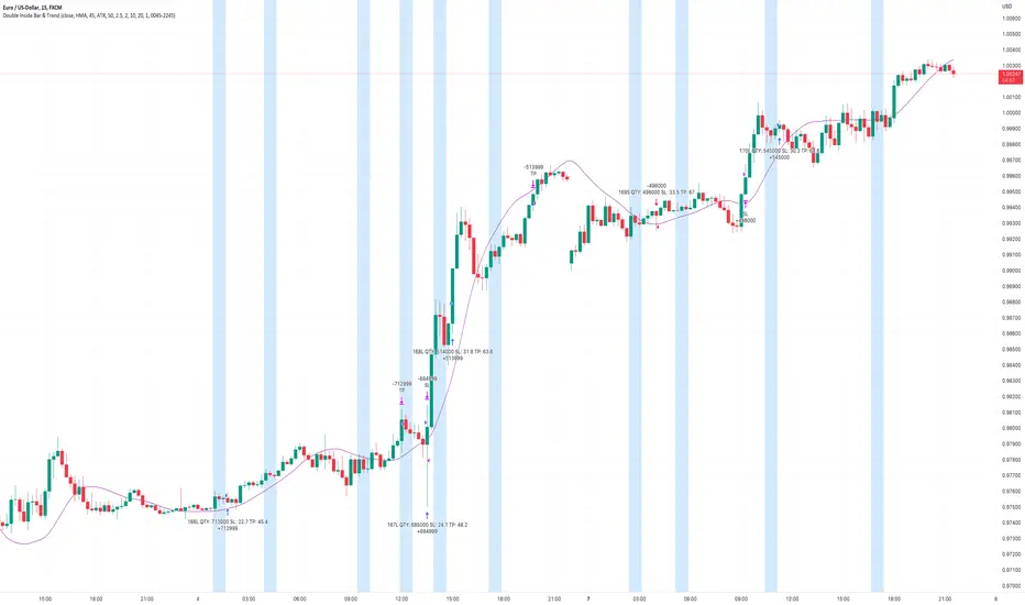 This strategy combines the Double Inside Bar candlestick pattern with a trend filter. Once the second inside bar closes and price is above trend moving average, a buy stop order is placed at high of the candle. If price is below trend moving average, a sell stop order is placed at the low of the candle.