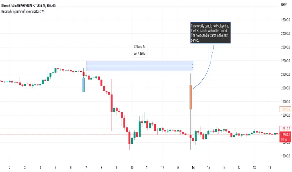This indicator gives you the ability to display a heiken ashi candle on top of your regular chart. The period of the candle can be changed. The example above shows the 1W heiken ashi candle on top of the 4h candle.