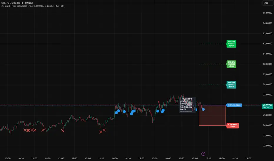 stelaraX – Risk Calculator is a trade planning and risk management indicator that visualizes entry, stop loss, and up to three take profit levels directly on the chart. The script calculates risk amount and position size based on account size and risk percentage, and it supports both long and short trade scenarios.