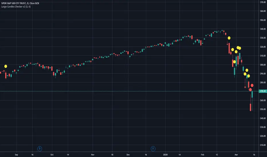 Using this indicator allows you to indentify large candles directly in your stock chart at first glance. The algorithm of the indicator *Large Candles Checker v2* was optimized in this new indicator as well as it using the new pine script version v4. For backwards compatibility reasons this indicator is published as v2.