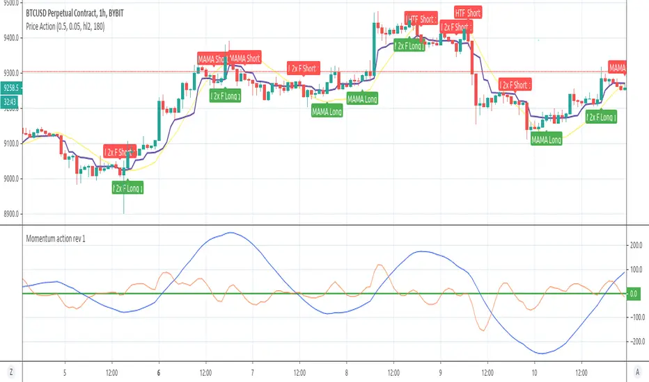 Signal for opening short / sale position is when Price drop bellow the yellow line of the Indicator ( Price action ) and same time the red line of the Indicator Momentum Action is dropping .