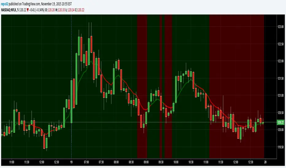 This script will color the background based upon whether it is positive or negative for the day. When looking at numerous charts, you can instantly see if they are up or down for the day. For me, I like to be going long on the stocks that are already moving up and short on the ones that are moving down. When using lower time frames, you can lose perspective of where it is on the daily chart.