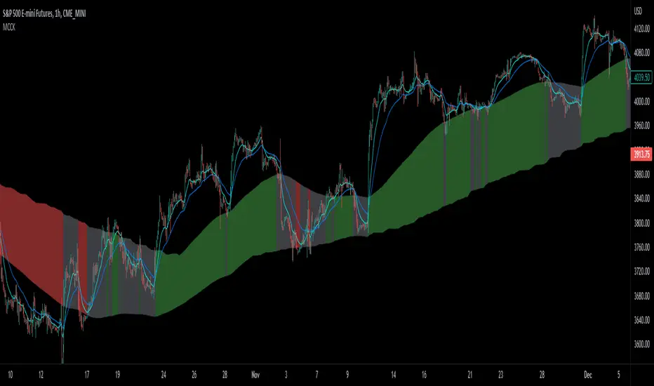 This script allows you to build your own customized ribbon/cloud out of a combination of up to 10 moving averages of various lengths/types. The maximum and minimum of all the moving averages considered simultaneously at each period define the envelope of the cloud. Each moving average can be plotted or invisible and selectable for inclusion in the construction of the cloud. The defaults provide an example of a simple cloud plus individual moving averages.