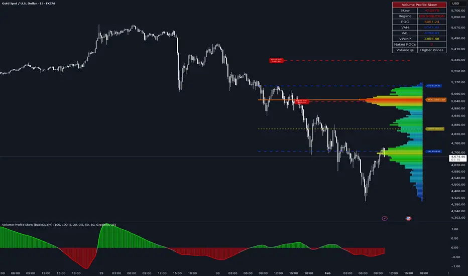 A standard volume profile shows where volume traded, but it does not quantify the shape of that distribution in a single number. This script builds a volume profile over a rolling lookback window, extracts the key profile levels (POC, VAH, VAL, and a volume-weighted mean), then computes the skewness of the volume distribution across price bins. That skewness becomes an oscillator, smoothed into a regime signal and paired with visual profile plotting, key level lines, and historical POC tracking.