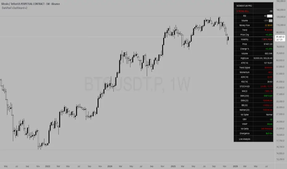 The core of the system is a composite Momentum Score, which calculates a value between -100 and +100 based on a weighted average of RSI, MACD, Stochastic, and Rate of Change (ROC). This score drives the main "Signal" output (e.g., STRONG BUY, HOLD, SELL). Additionally, the dashboard integrates a suite of volume analysis tools—including VWAP, OBV, and Volume Delta—alongside volatility and trend filters to provide a complete market health check at a glance.