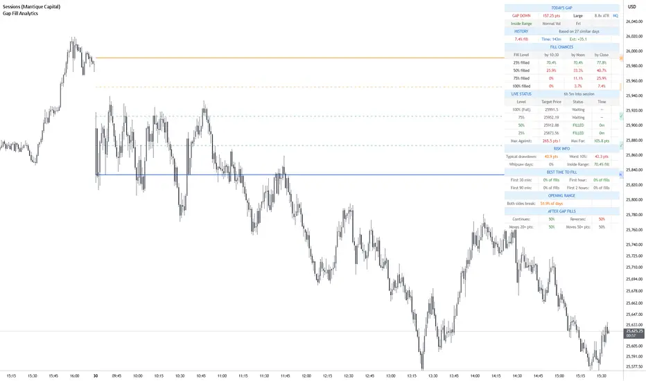 This indicator shows you the real probability of gap fill based on historical data analysis of 2,600+ ES and 2,700+ NQ trading days.