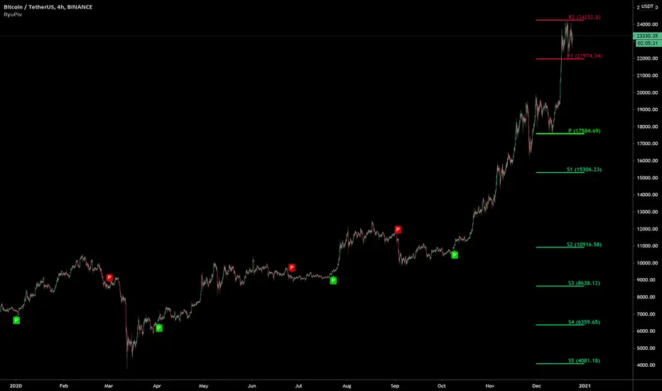 📌Shows the same pivot levels from the Pivot Points Standard (Pivots) indicator on the Traditional settings. But with 3 indicators in one, can show the daily, weekly, and monthly levels all in one indicator. This indicator only shows the current pivot level and not the previous ones and will auto adjust update to the newest one. The current pivot line levels are shown across the chart.