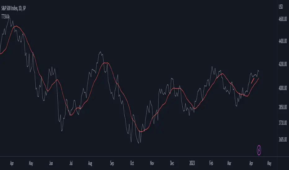 The TTSMA indicator takes a standard simple moving average (SMA) and shifts it forward in time by a user-defined number of bars. The main idea behind the TTSMA is to provide an estimate of future trend direction, based on current market data. When the "Singularity" option is enabled, the TTSMA line changes color according to the moving average's direction, turning green for upward trends and red for downward trends.
