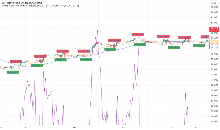 The "Swing Highs and Lows Predictor" is a comprehensive Pine Script indicator designed to help traders identify potential swing highs and lows in the market. This indicator combines moving averages, RSI, Fibonacci retracement levels, and volume analysis to provide a holistic view of market trends and reversals.