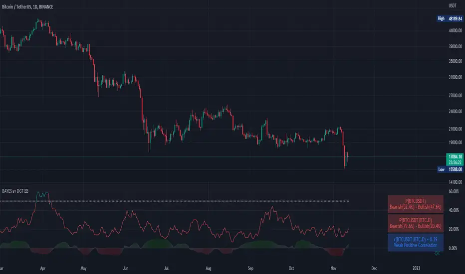 major update : usage extended to all markets. Condition to calculate the Bayesian probability of chosen symbol can be selected by the user of their choice that they believe related to the chosen symbol. Condition can be another symbol or index additionally the base line moved to 0, so values above 0 indicates the probability of bull move is higher and values below 0 indicates the probability of bull move is lower