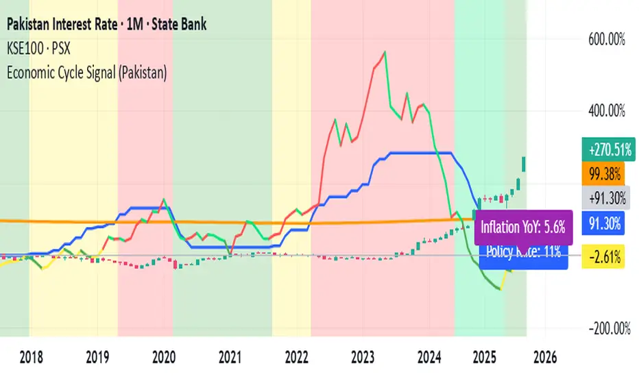 This indicator overlays both the Pakistan Policy Rate (PKINTR) and the Pakistan Inflation Rate YoY (PKIRYY) directly onto your KSE or Pakistan market chart. It visually connects monetary policy and inflation dynamics with market performance, helping traders and analysts understand how shifts in economic conditions impact risk assets in Pakistan.