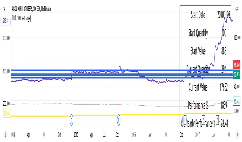 Overview: The DRIP Yearly Performance indicator is designed for long-term investors using Dividend Reinvestment Plans (DRIP). This script calculates both the total and average yearly performance of an asset, factoring in the reinvestment of dividends over time. It provides key insights into portfolio growth by tracking the number of accumulated units from dividend reinvestment and how this impacts overall performance.