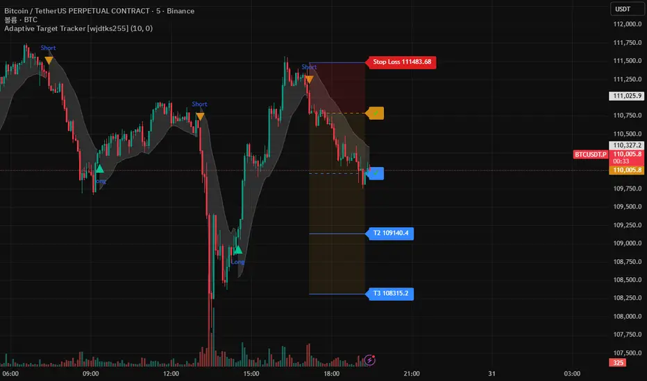 The Adaptive Target Tracker is a trend-following indicator that combines moving averages with an adaptive ATR (Average True Range) calculation to detect market trends with dynamic sensitivity. It plots entry lines, multiple profit targets (T1, T2, T3), and stop-loss levels directly on the chart, enabling traders to visualize trade setups clearly.