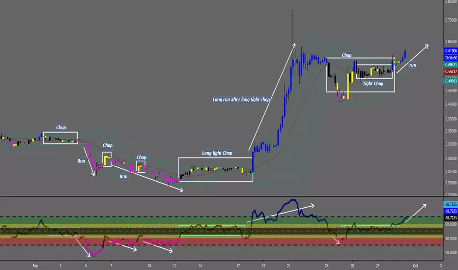 tight chop is RSI movement between 45 and 55. There should be an explosion after RSI breaks through 60 (long) or 40 (short). Tight chop bars are colored black, a series of black bars is tight consolidation and should explode imminently. The longer the chop the longer the explosion will go for. tighter the better.
