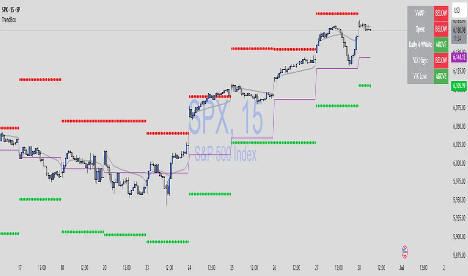This indicator is called "TrendBox," designed to help traders analyze daily price ranges using several technical indicators. Below is a breakdown of its functionality, purpose, and key components: