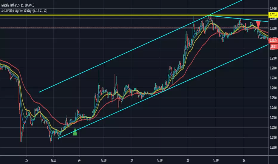 This strategy is explained by CryptoJack, which mentions it is a simple beginner strategy, but an experienced trader can certainly benefit from it because it brings ease. This script plots the EMA's with the periods: 8, 13, 21, 55. Then it looks when the EMA's are alined from smaller period to higher period (representing an uptrend). The moment this happens a green triangle appears at the buy point. When the opposite occurs an exit signal is given by showing a red triangle.