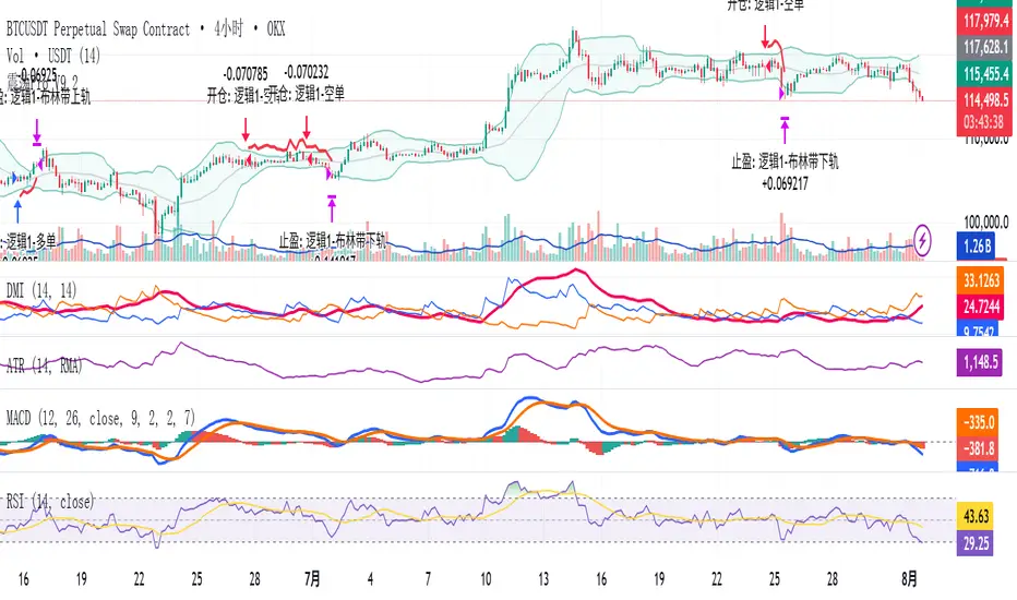 该策略基于布林带 (Bollinger Bands)、RSI、MACD、ADX 等经典指标的组合,通过多逻辑模块化结构识别震荡区间的价格反转机会,支持多空双向操作,并在相同逻辑下允许智能加仓,适用于震荡市场的回测和研究。