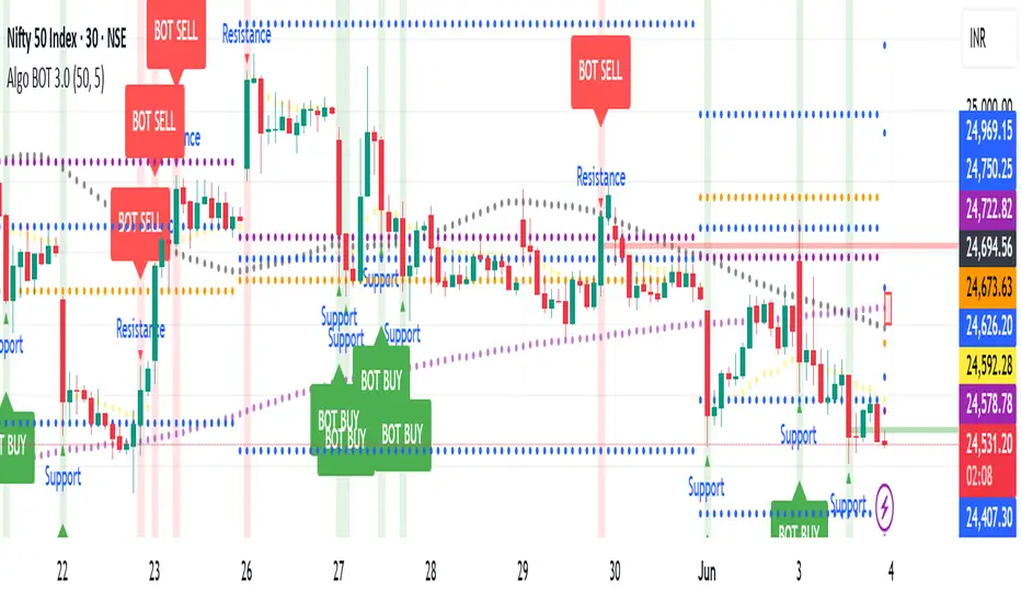 Algo BOT 3.0 is a custom-built Pine Script indicator designed for educational and technical analysis purposes. It is developed to help traders visually explore how price behaves around critical support/resistance areas by combining multiple classic indicators and dynamic candle detection logic. The tool highlights potential Call Entry (CE) and Put Entry (PE) zones using structured visual markers and alerts, based on real-time chart interactions with pivot levels and Fibonacci retracements.