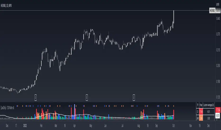 By enabling MTF function in this indicator, you can check turnover rate on lower or higher time frame than your current time frame. This is shown by table with customizable table location, size and text color. Also, you can enable float shares info as well in extra column, which might be useful when you have other types of shares selected in T/O Rate Mode other than float shares type.