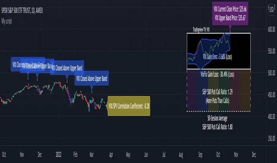 VIX correlation to an asset's price fluctuations, the average close-to-close gain/loss subsequent a $VIX/VixFix close above the upper Bollinger Band, the average 5-session gain/loss following the same occurrence in addition to the average 10-session gain/loss, all close-to-close, 5 session, and 10-session gains/losses are stored as tooltips for labels on the chart. The current close-to-close percentage gain/loss for