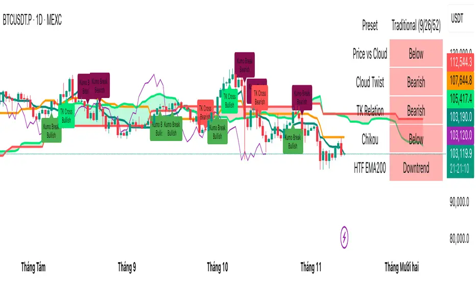 This indicator combines the visual clarity of Ichimoku with advanced filters, adaptive presets, and built-in signal logic to help traders make more confident trend-based decisions.
