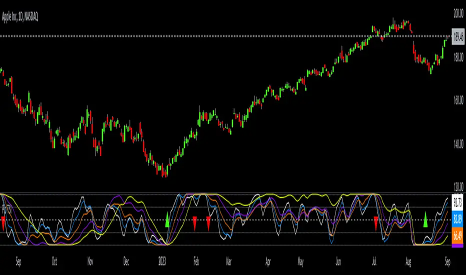 The Fib TSI indicator uses Fibonacci numbers input for the True Strength Index moving averages. Then it is converted into a stochastic 0-100 scale.