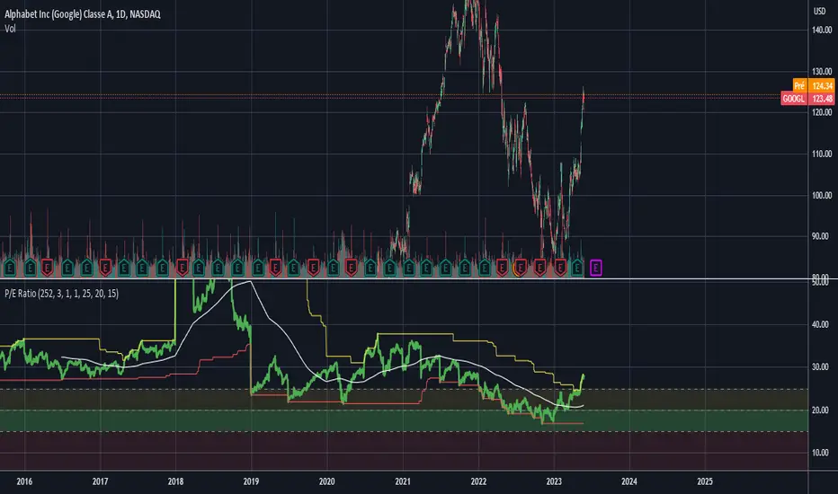 Plots the P/E Ratio with highest, lowest and average, as well as two ranges, 25-20 & 20-0 considered as the regular P/E Range