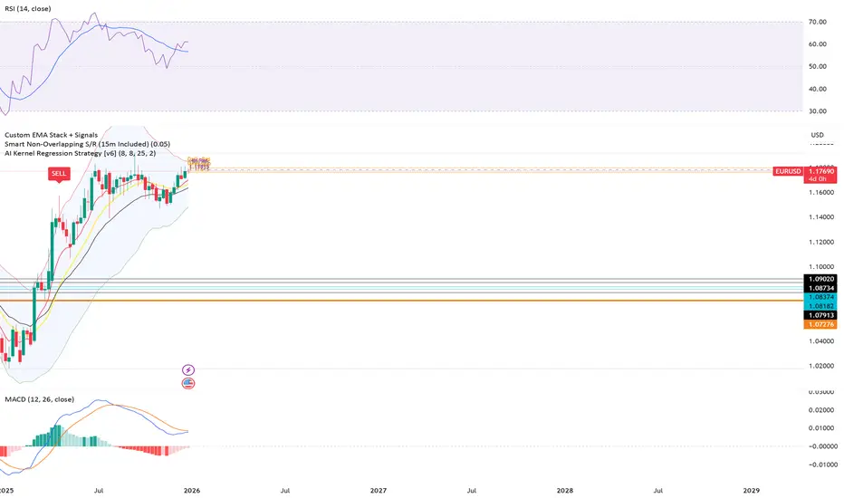 • Plots EMA 8, 21, 50, 100, 200 with toggles to show/hide each one.